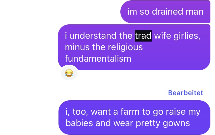 A friend wrote to me recently, “I really feel like the universe is pushing you towards something you can do for yourself…” I feel this too, I guess. I decided to get serious about writing (which is why I finally got a domain for this blog and started a Substack). While I love to write and have never not enjoyed it, even in school or university, I vented to my friend about how I wish a detour felt more like my choice rather than a semi-forced path because I had no other options. Maybe this feeling of lack of choice is why I’m the opposite of a trad wife: I hate doing things because I am made to by tradition, a husband, society, the economy, etc.